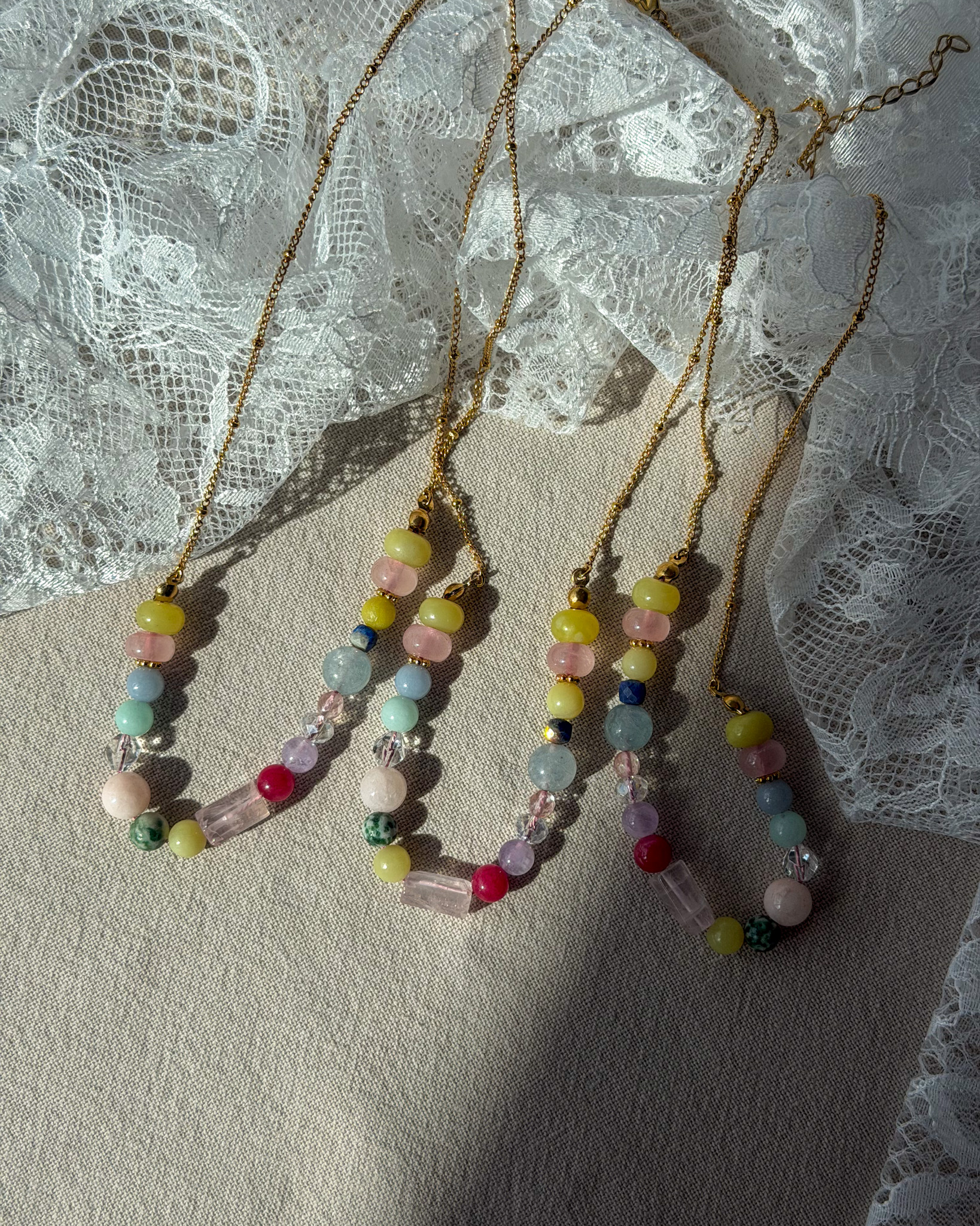 Diese handgefertigte Edelsteinkette bringt Farbe in deine Basics – ohne aufdringlich zu sein. Die feinen, unterschiedlich schimmernden Steine machen sie zu einem besonderen Detail, das jedes schlichte Outfit sofort aufwertet.