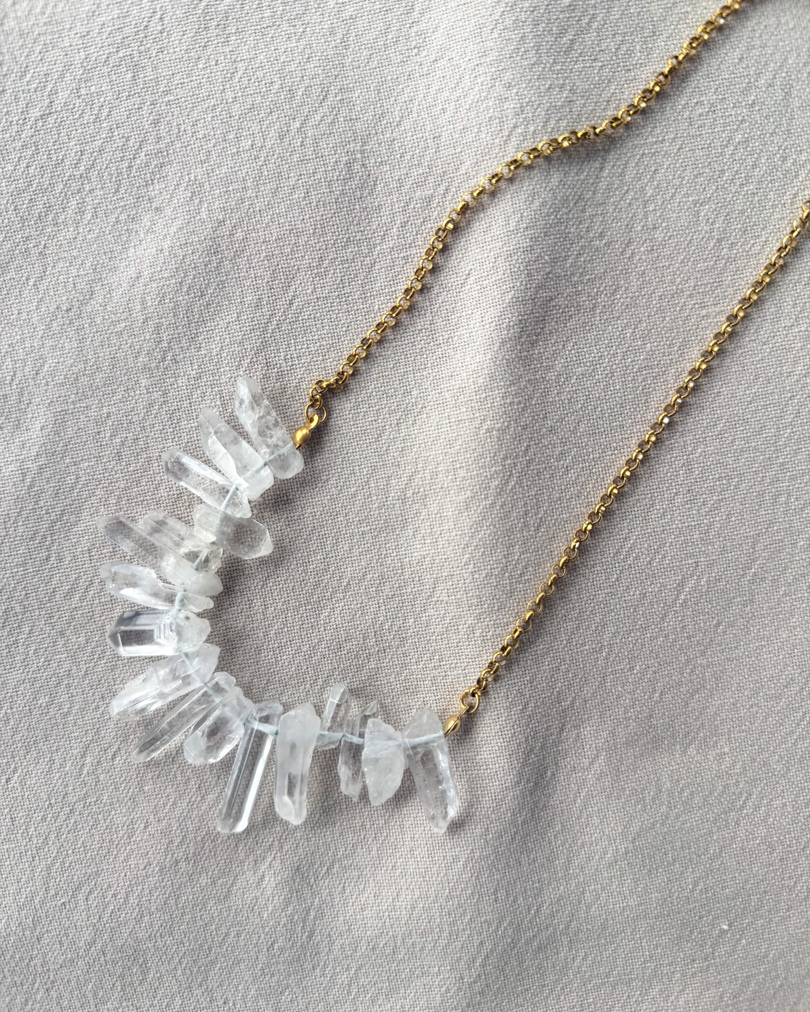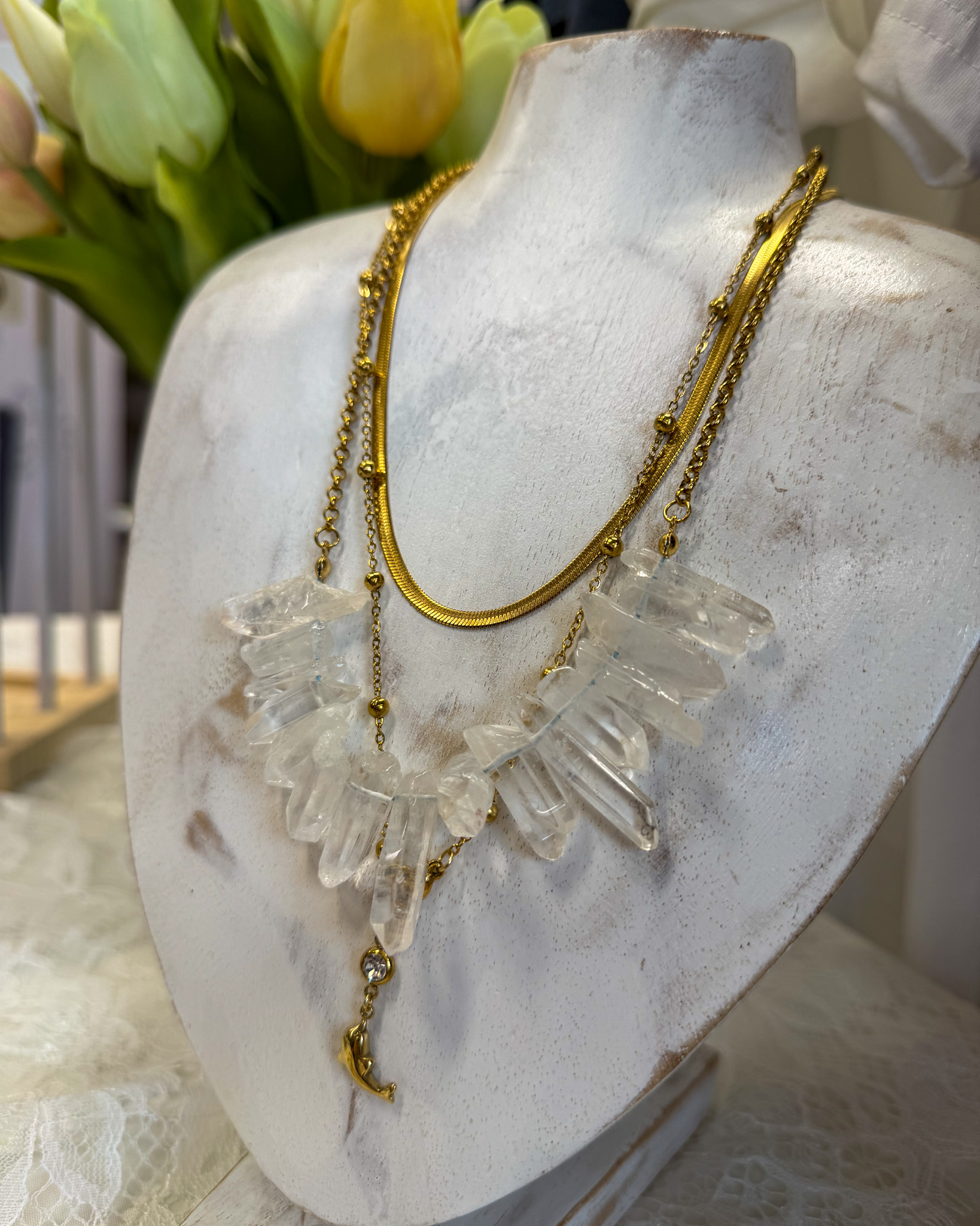 Diese Kette kombiniert eine feine Goldkette mit rohen Bergkristall-Spitzen. Klar, reduziert und trotzdem ein echtes Statement.