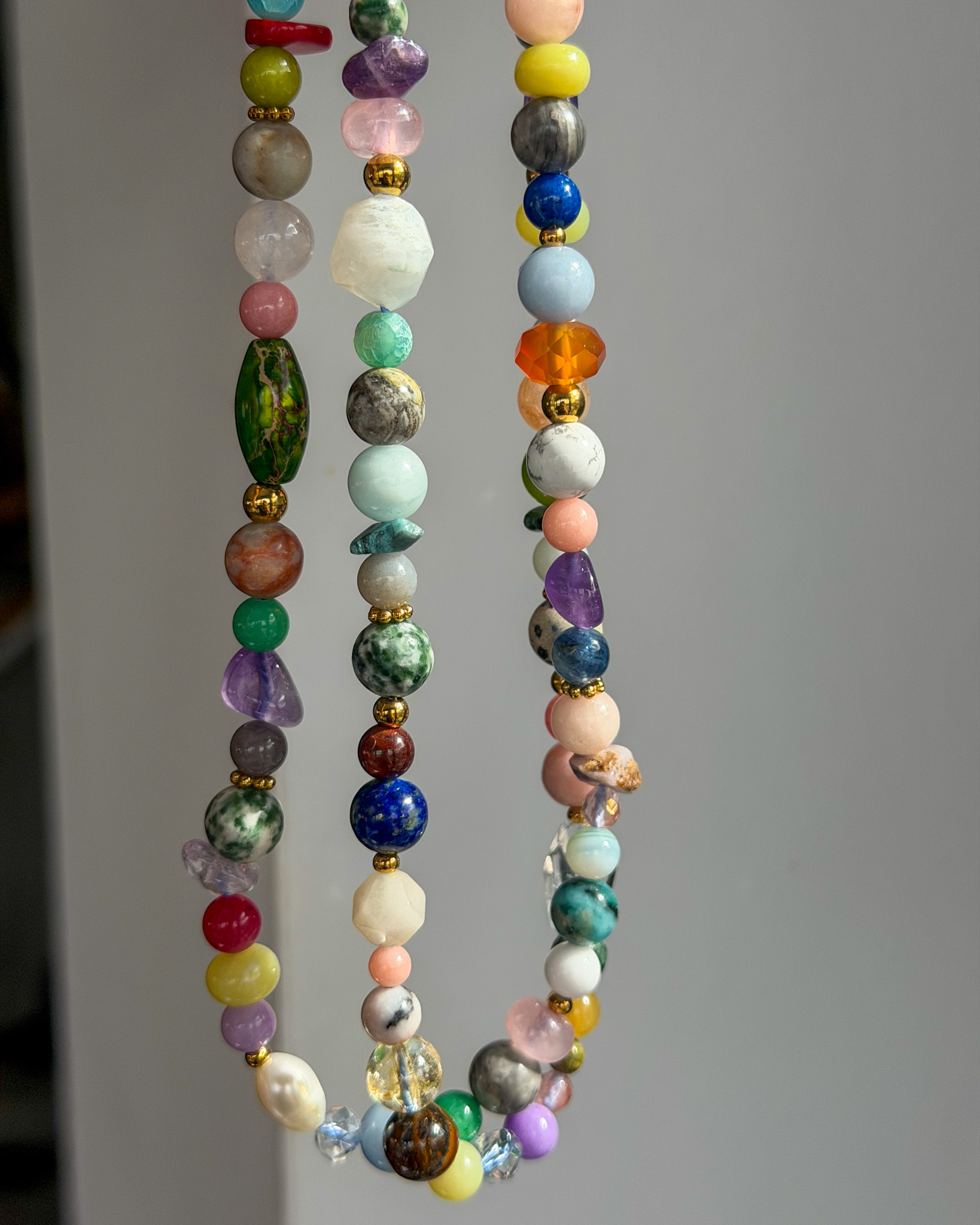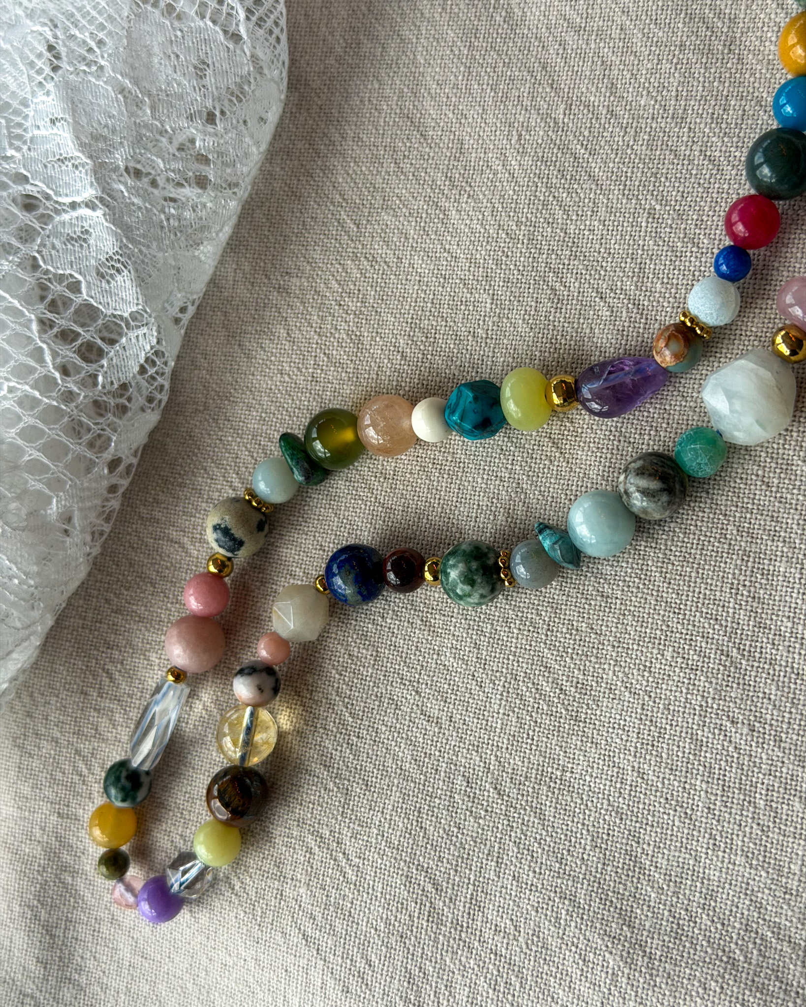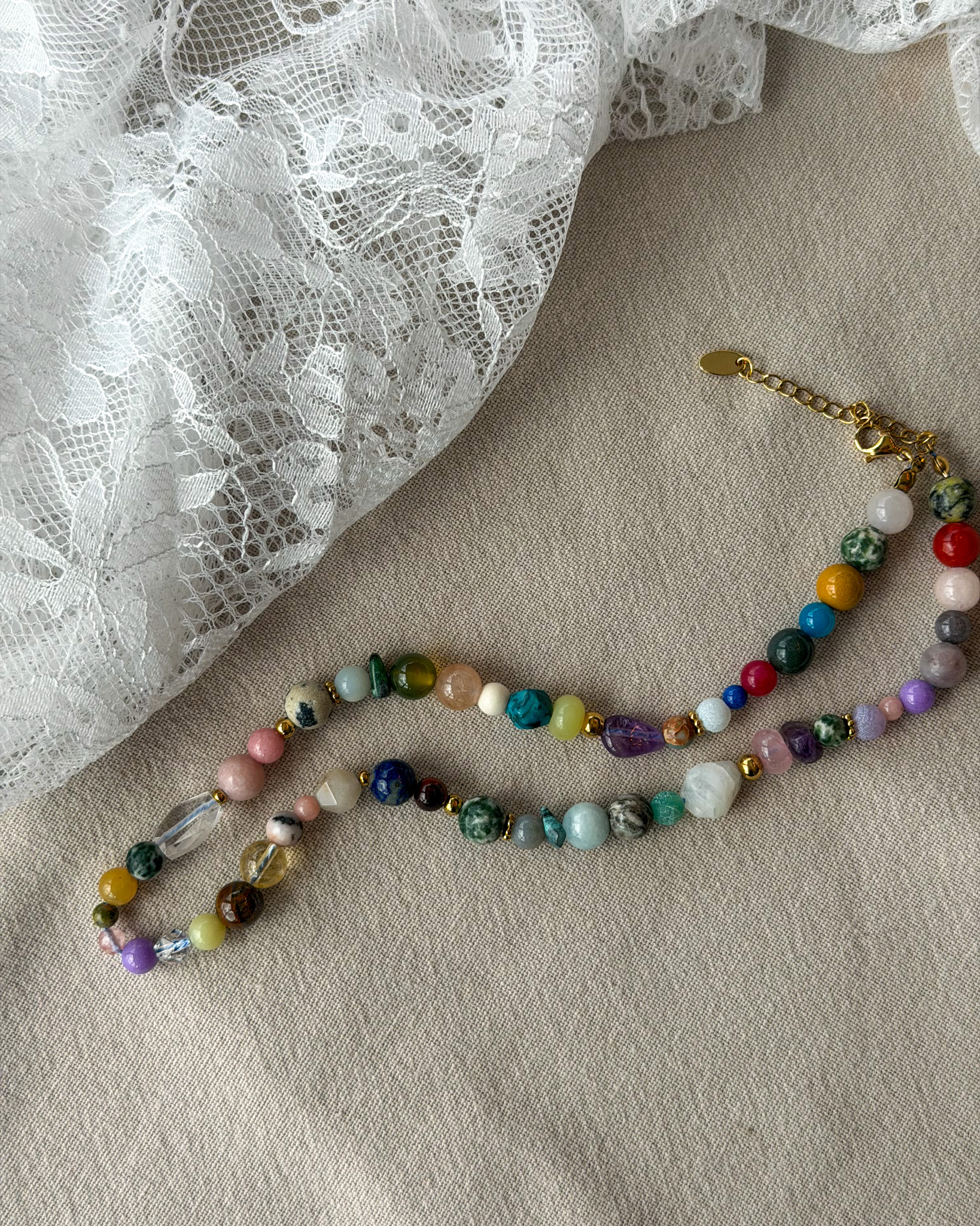 Diese Kette ist ein Mix aus verschiedenen Edelsteinen – bewusst bunt, aber trotzdem stimmig. Sie wirkt leicht, unkompliziert und macht jedes Outfit direkt interessanter.