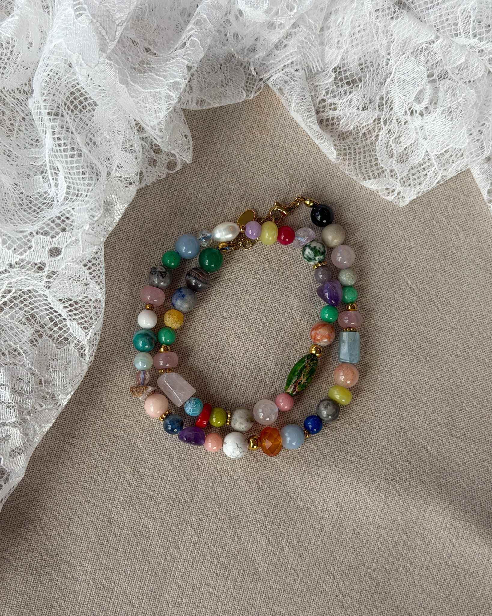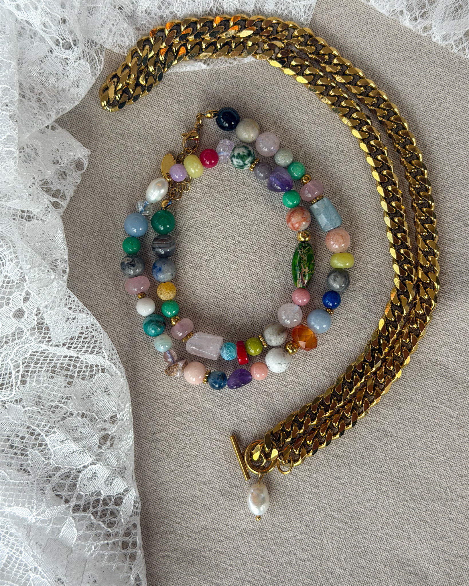 Diese Kette ist ein Mix aus verschiedenen Edelsteinen, Farben und Formen – bewusst nicht perfekt, sondern genau so gewollt. Sie wirkt wie gesammelt und gibt jedem Look sofort mehr Charakter.