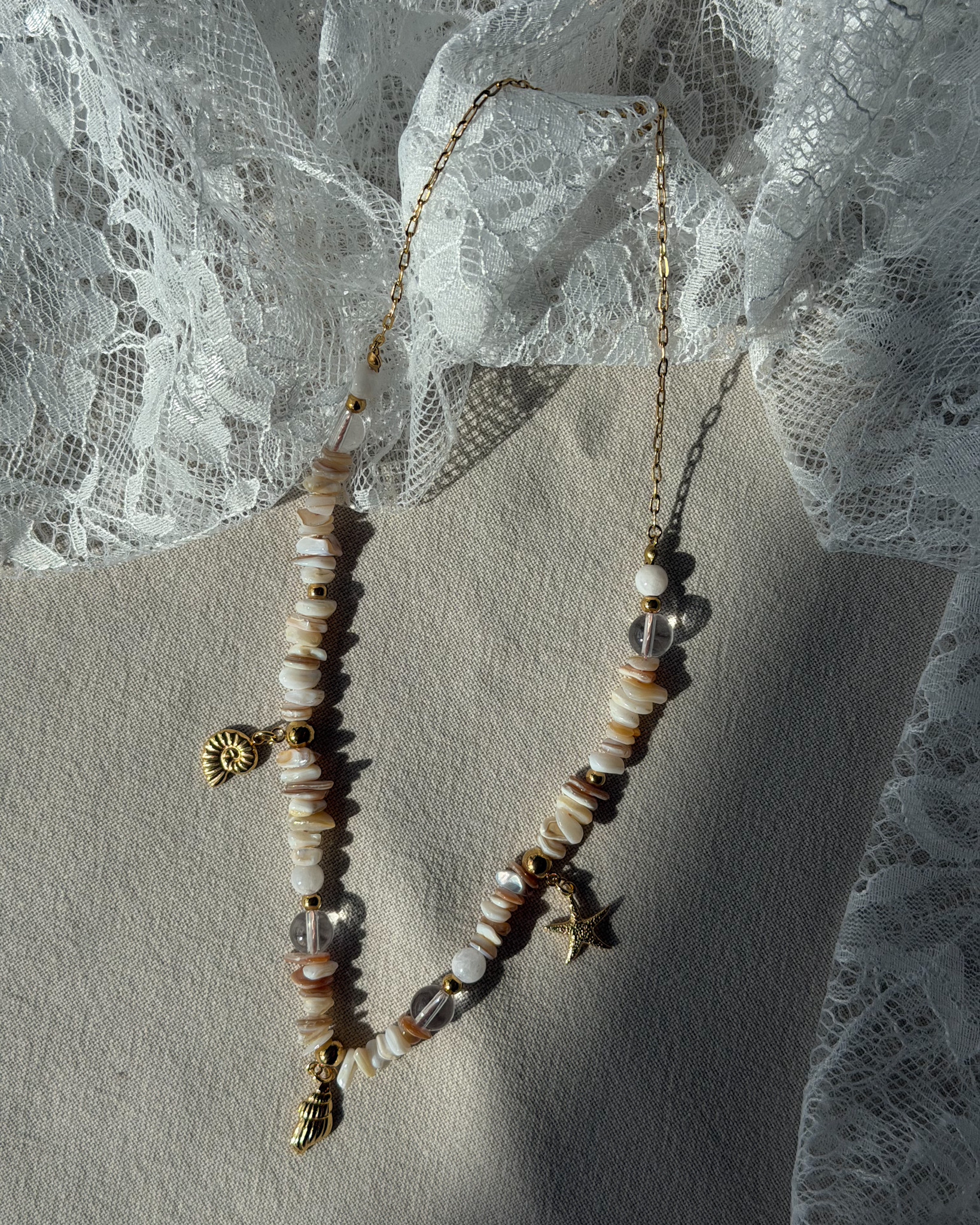 Diese handgefertigte Kette erinnert an Sonne, Meer und warme Tage. Natürliche Muschelelemente kombiniert mit klarem Bergkristall und goldenen Details machen sie leicht und besonders.