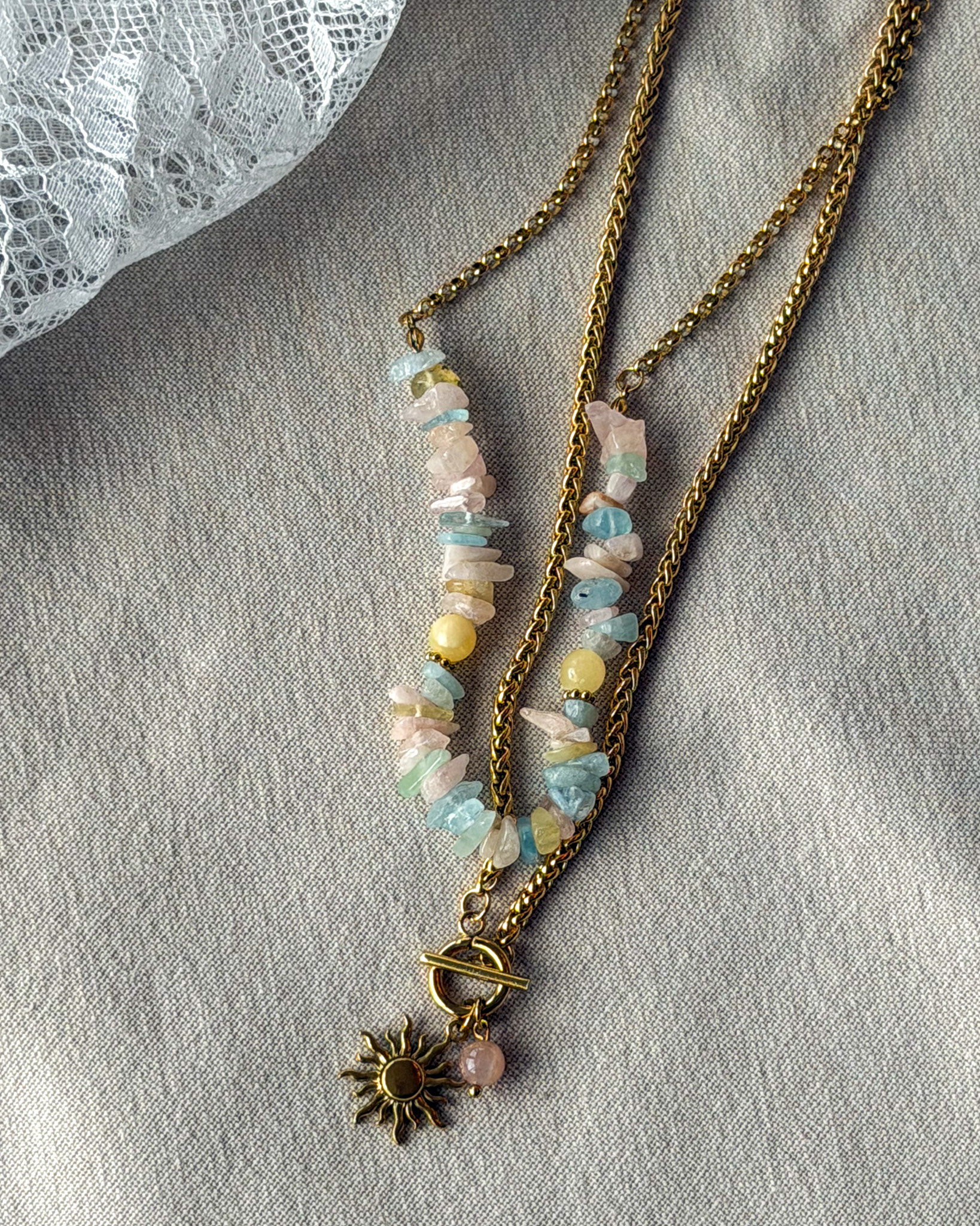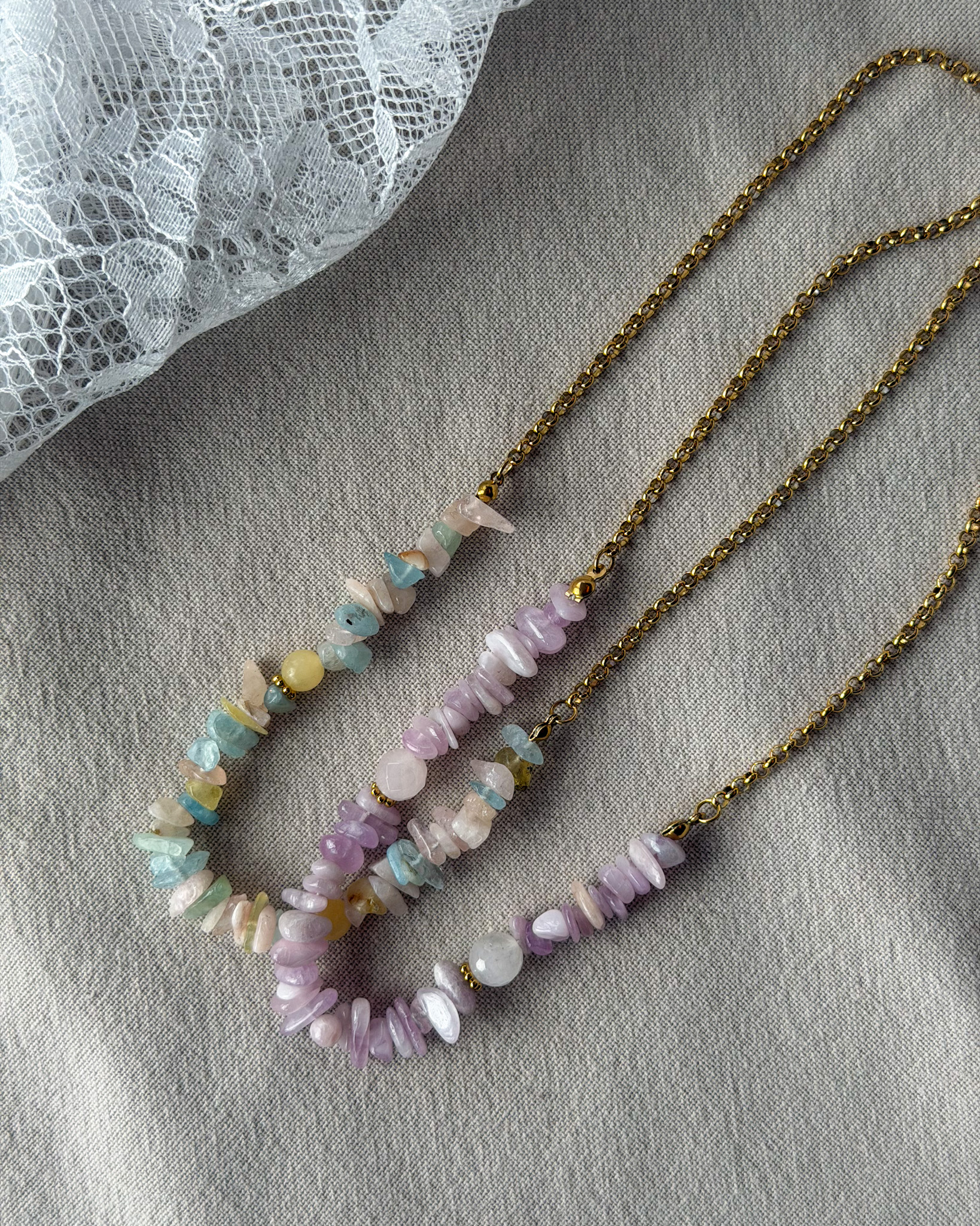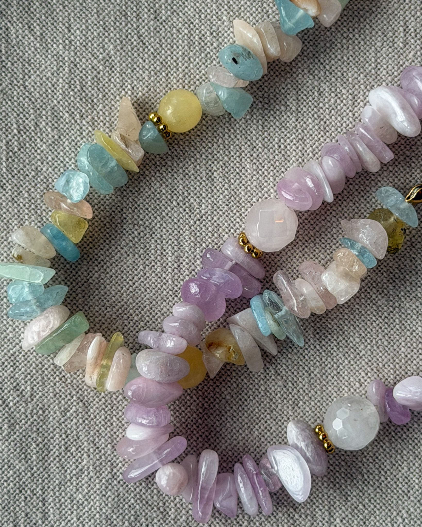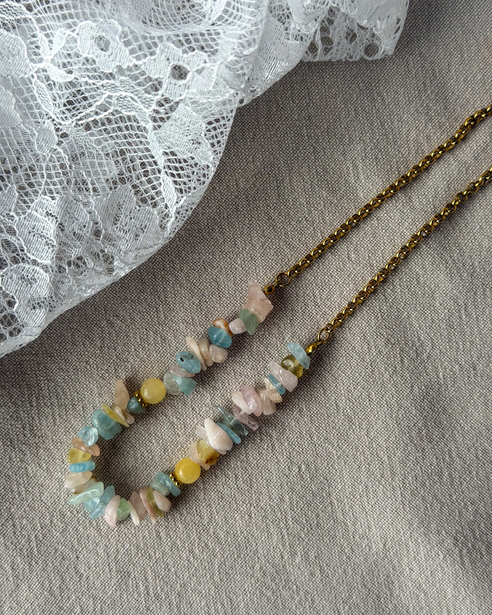 Diese handgefertigte Kette kombiniert zarte Morganit-Splitter mit warmen Jade-Details und goldenen Elementen. Die Mischung aus soften Pastelltönen und der markanten Kette macht sie besonders – leicht, aber trotzdem präsent.